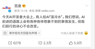 7月3日晚,百度在社交網(wǎng)站上發(fā)布潑水事件發(fā)表正式回應“針對今天在AI開發(fā)者大會現(xiàn)場的時間,我們感到憤怒,并強烈譴責肇事者的行為!”“AI前進的道路上有著各種各樣意想不到的事情發(fā)生,但我們前行的決心不會改變?!?/span>